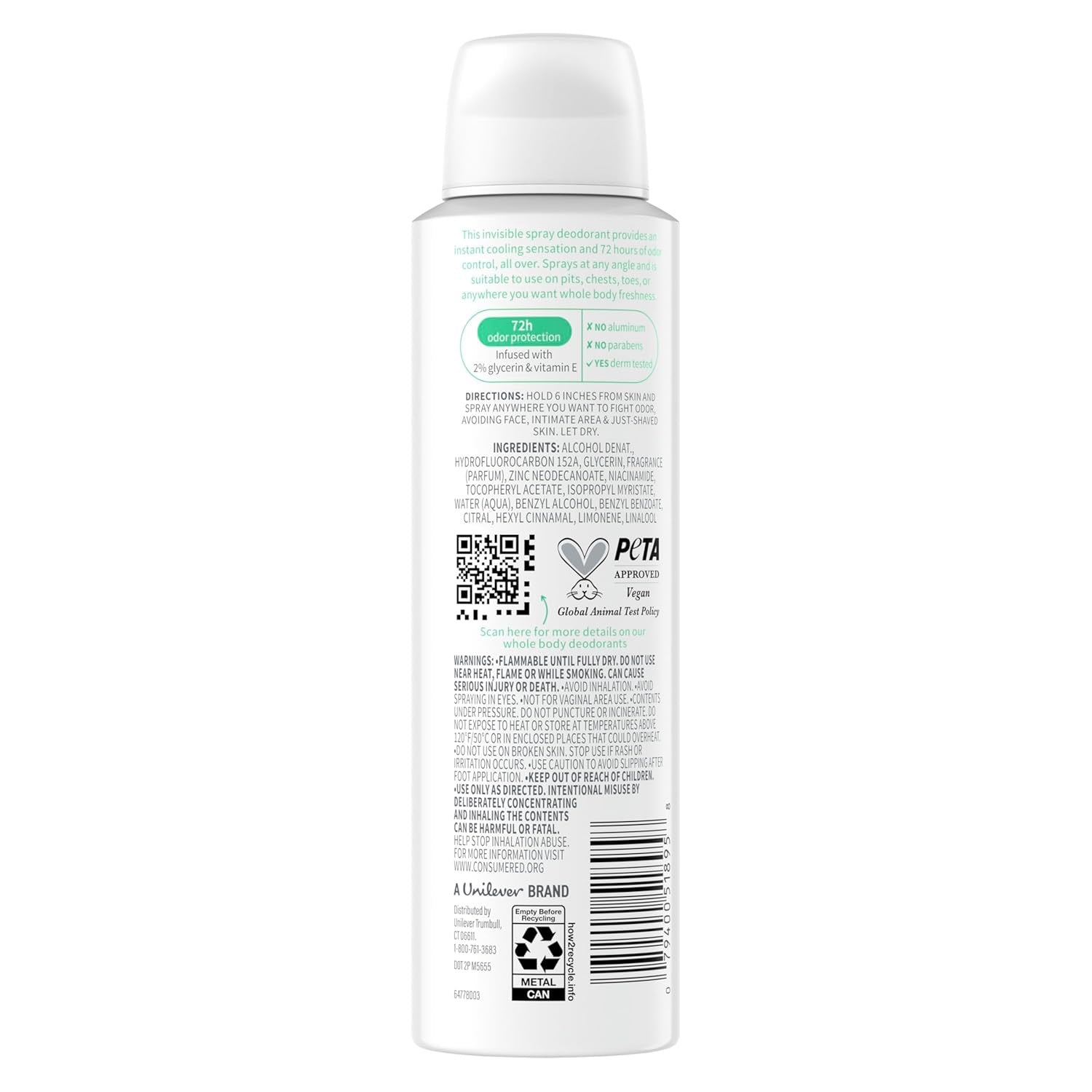 Feel fresh and calm all day with Dove Whole Body Deodorant Cooling Spray in Sage & Lavender. This all-over body spray provides effective odor protection with a soothing herbal-floral scent and a refreshing cooling sensation.