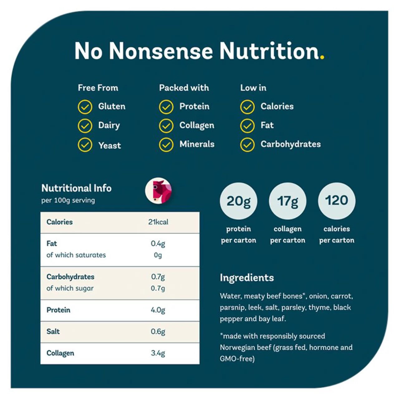 Gold Nourish Awards 2022. Contains 20g Protein, 17g+ Collagen and 105 Calories per pack. Gluten, Dairy & Yeast Free. Responsibly sourced pasture-fed Norwegian cows (hormone and GMO free). Simmered for up to 24 hours.