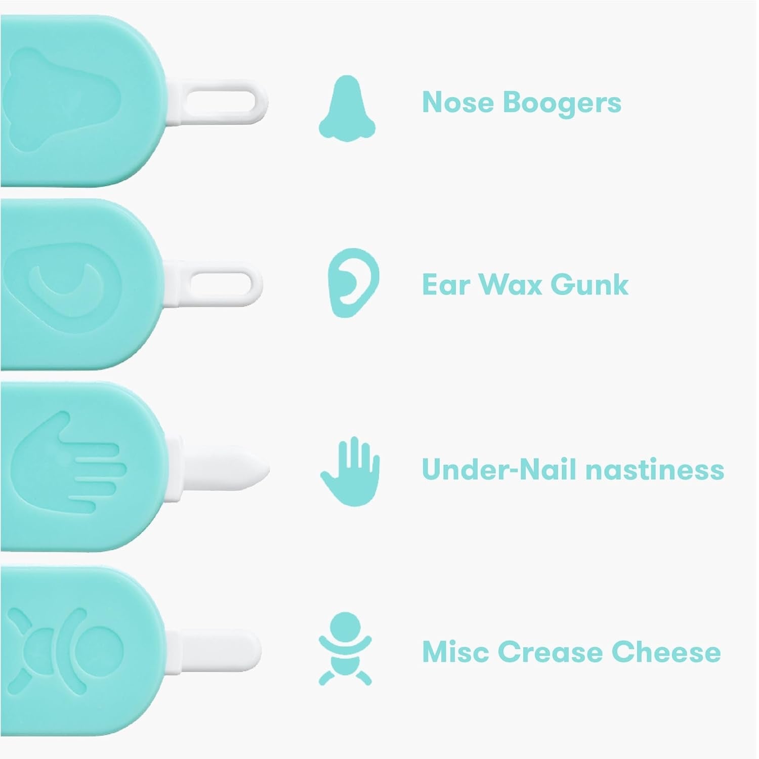 - FOUR FLEXIBLE TIPS: Four specialized silicone-tipped tools include a curved nose picker for stubborn boogers, precision ear scoop for gentle wax removal and nail cleaner for under-nail debris. A multipurpose tip for other tricky spots, all designed with flexible yet durable materials that safely navigate delicate areas without scratching or irritating baby's sensitive skin