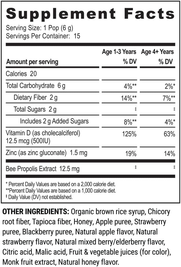 - BOOST THEIR IMMUNITY: Vitamin D, elderberry*, and zinc deliver added immune defense, while propolis contains over 300 beneficial compounds, antioxidants, and vitamins that support the immune system.