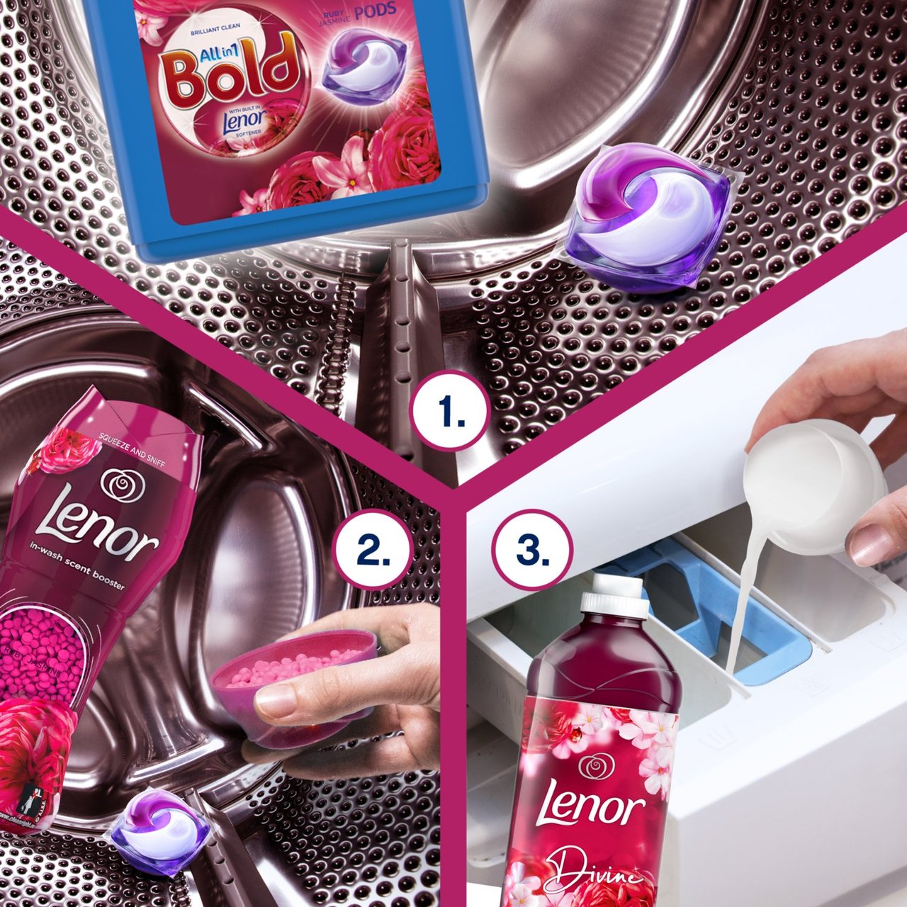 Lenor Fabric Conditioner Ruby Jasmine is designed with a delicate scent of jasmine and provides 48 washes of freshness, leaving fabrics feeling soft and smelling great. It works to care for clothes and also helps to reduce ironing time.