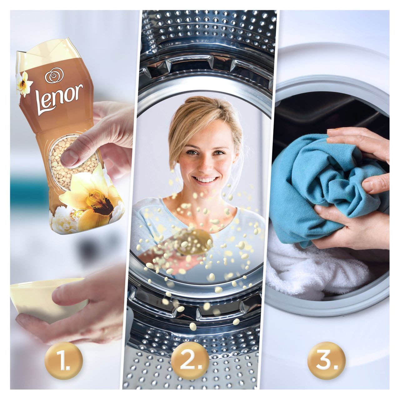 Discover Lenor in-wash scent booster, the last born of the Lenor feel-good experience. For a boost of freshness from wash to wash (up to 12 weeks in storage), Lenor infuses your clothes with Gold Orchid scent. This elegant scent is infused with a seductive hint of precious vanilla that comforts the emotions and calms the spirit. Blended with Mimosa, honey rose accords and creamy peach, Lenor Gold Orchid awards you with an incredible indulgent and luscious experience. Lenor Gold Orchid In-Wash Scent Boosters was created to work in perfect harmony with Lenor Gold Orchid Softener. They are enchanting on their own… and irresistible together. I feel good in Lenor.