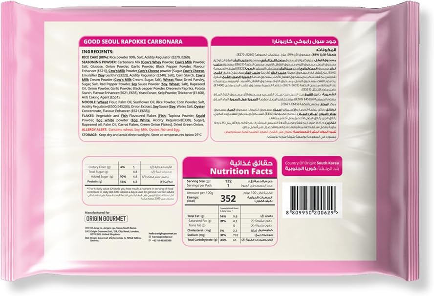 Good Seoul Rapokki Carbonara Rice Cake with Ramen offers a unique fusion of flavours, combining the creamy richness of carbonara with chewy rice cakes and ramen noodles. This product has a moderate fat content, making it a satisfying yet indulgent choice for a quick meal or snack. Each pack weighs 132g, providing a generous serving that is perfect for sharing or enjoying on your own. With its convenient packaging and easy preparation, this dish is ideal for those seeking a delicious and comforting option that blends traditional Korean elements with Italian-inspired taste.