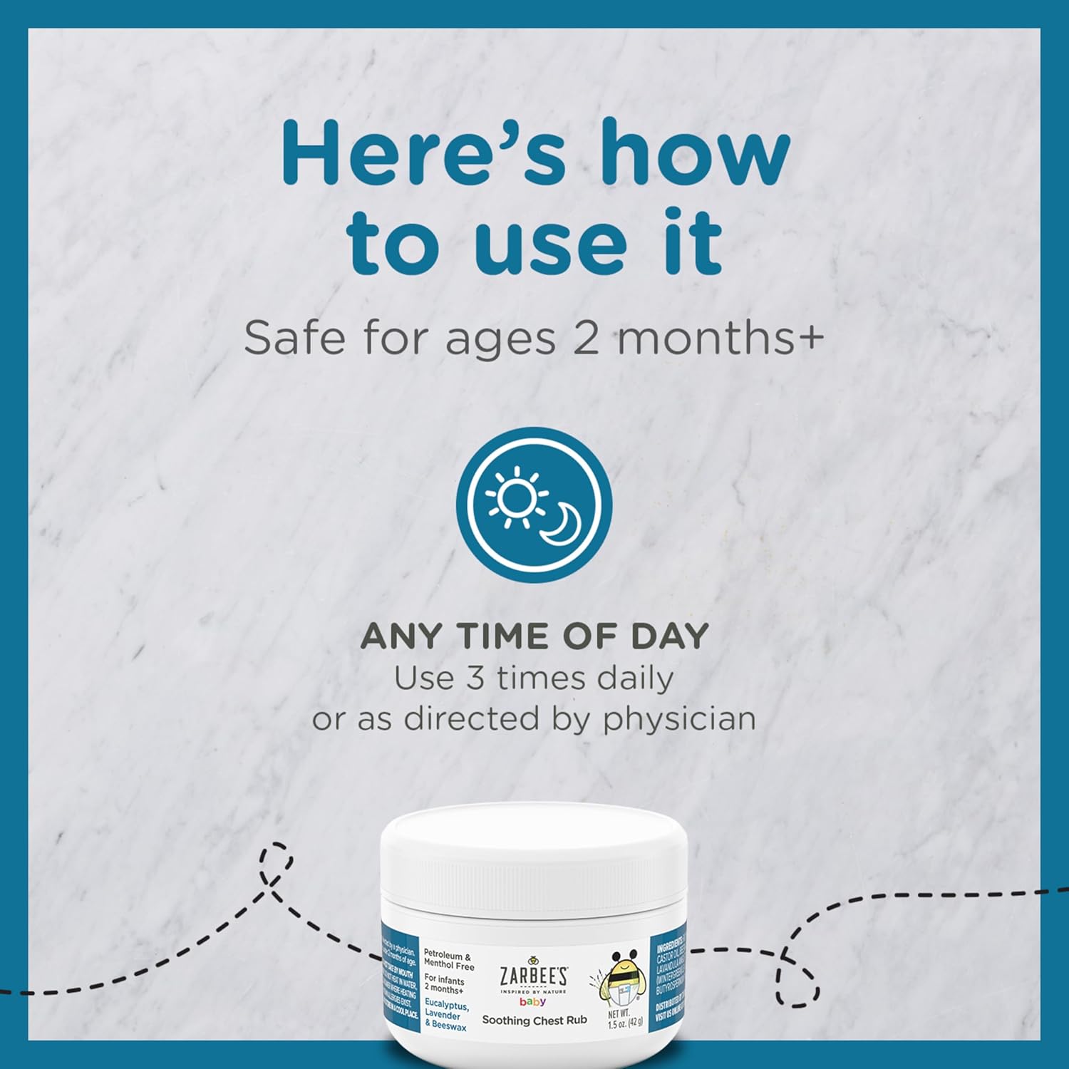 - SOOTHING CHEST RUB: Zarbee’s petroleum-free chest rub for babies features a blend of eucalyptus & lavender oils in a beeswax & shea butter balm, helps soothe baby without harsh chemicals or toxins.